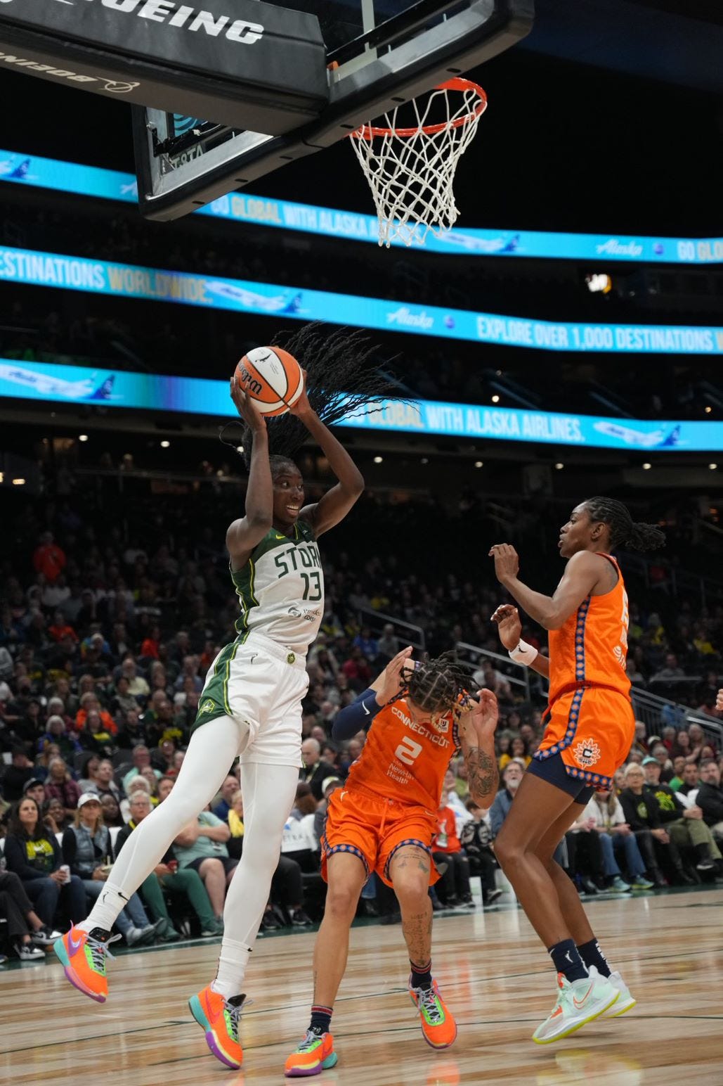 Connecticut won the tip-off and immediately had the ball on their end of the court. An easy two-on-one resulted in Tiffany Hayes scoring the game’s first basket. DeWanna Bonner then scored on the next possession to put the Sun up 4-0 early. Seattle picked up their defense and forced Connecticut into a 24-second shot clock violation on their third offensive possession.