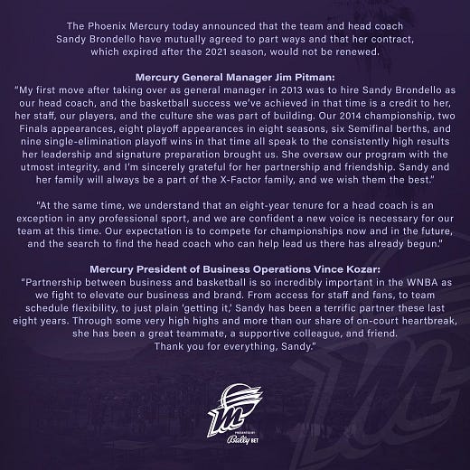 It should be noted that Brondello was not fired and that the organization simply opted to not renew her contract after it expired at the end of the 2021 season. It was announced as a mutual parting of ways. But that seems a bit odd when the team played so well after the Tokyo Olympic break (going 10-3) and reached the WNBA Finals with a 6-5 playoff record (1-0, 1-0, 3-2, 1-3).