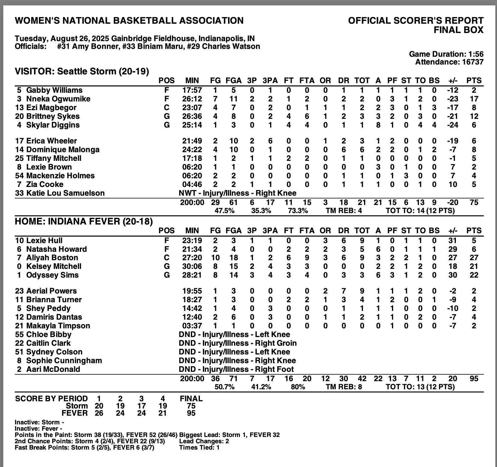 (Indianapolis, Indiana) - It wasn’t a matchup, it was a mismatch. The Indiana Fever (20-18) dominated the Seattle Storm (20-19) from pillar to (low) post. They led by 32 points in the 4th quarter, and carried a double-digit lead throughout the game, before ultimately securing the win 95-75.