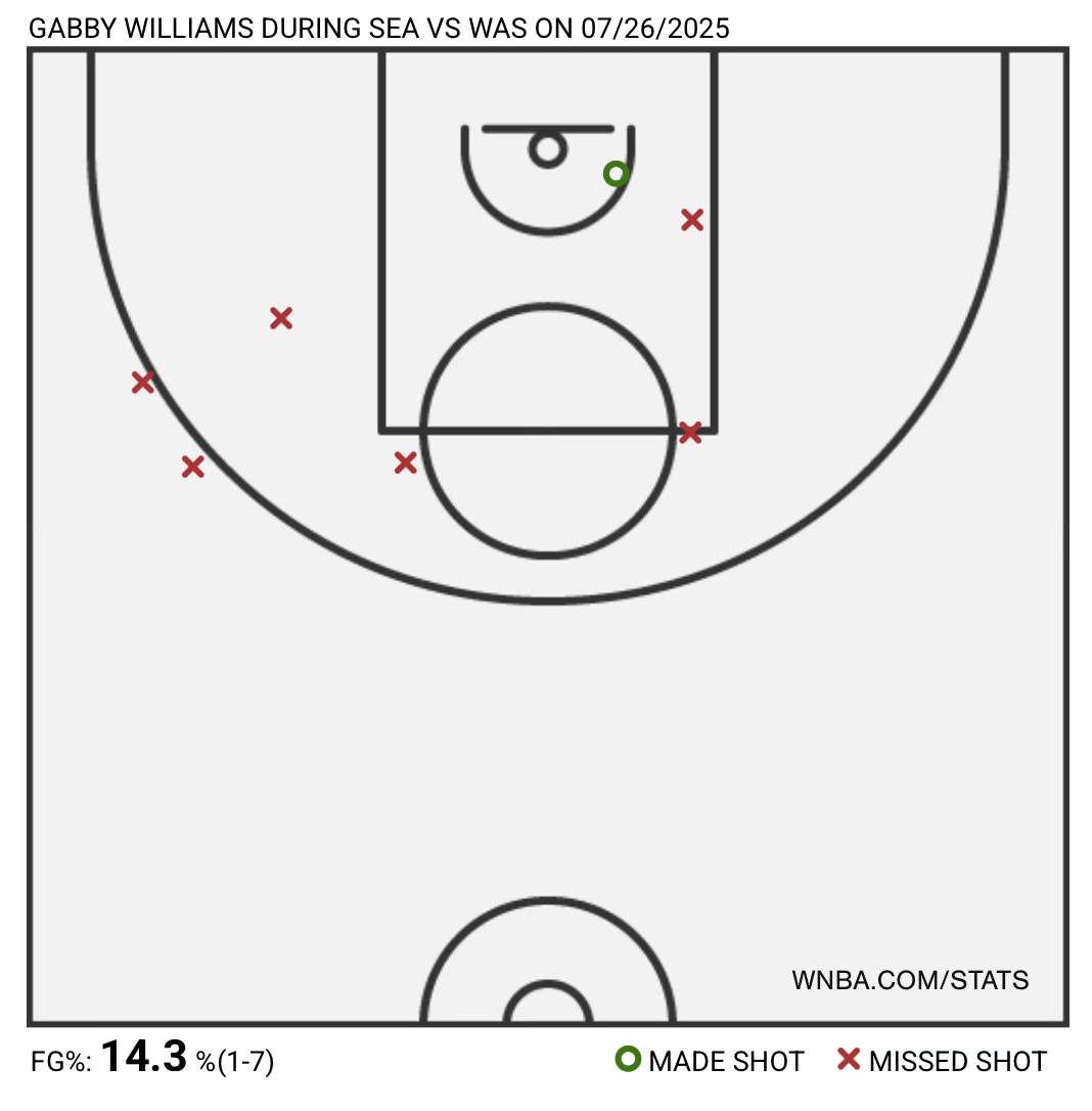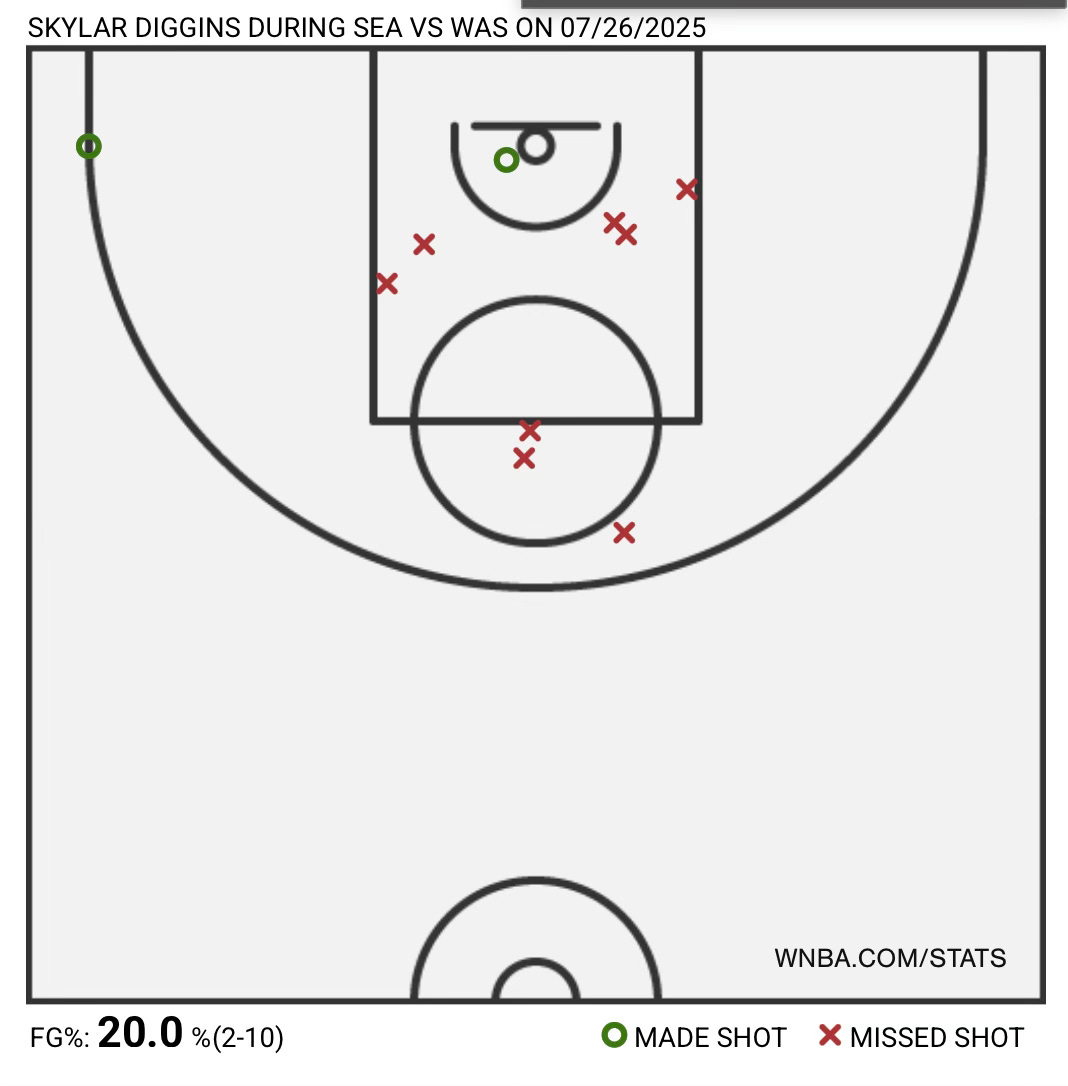 While Sykes did her jog against Diggins, it was rookie Sonia Citron who locked Gabby Williams down. Williams also struggled, managing to score just two points on 1-7 FG attempts. She also didn’t have as much impact in other areas as she normally does. Gabby finished with just two rebounds and one assist. When the two teams met on July 13th, Williams finished with six points on 2-9 FG shooting in that game.
