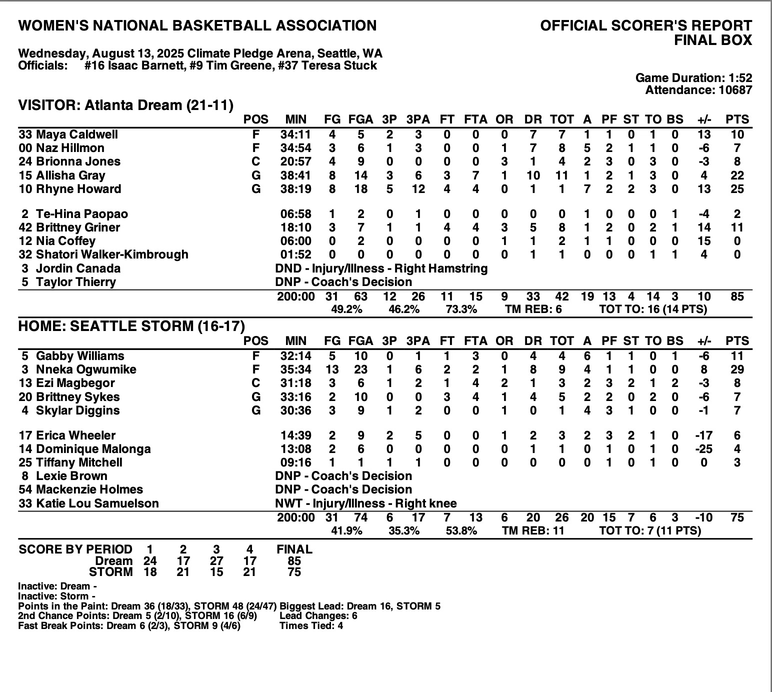 Atlanta had more balanced scoring as four players scored in double figures for the Dream. Besides Howard and Gray, they surprisingly got 10 points from Maya Caldwell, who scored all 10 of her points in the first half. Brittney Griner came off the bench and added 11 points and eight rebounds in 18 minutes.