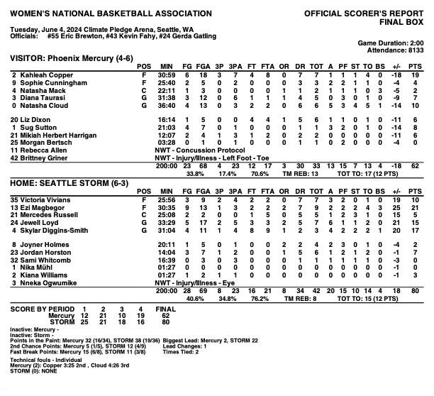 Natasha Cloud was the only other Mercury player to score in double figures with 10 points. She scored all 10 of those points in the first half. She was held scoreless over the final 20 minutes and went 0-6 FG during that time.