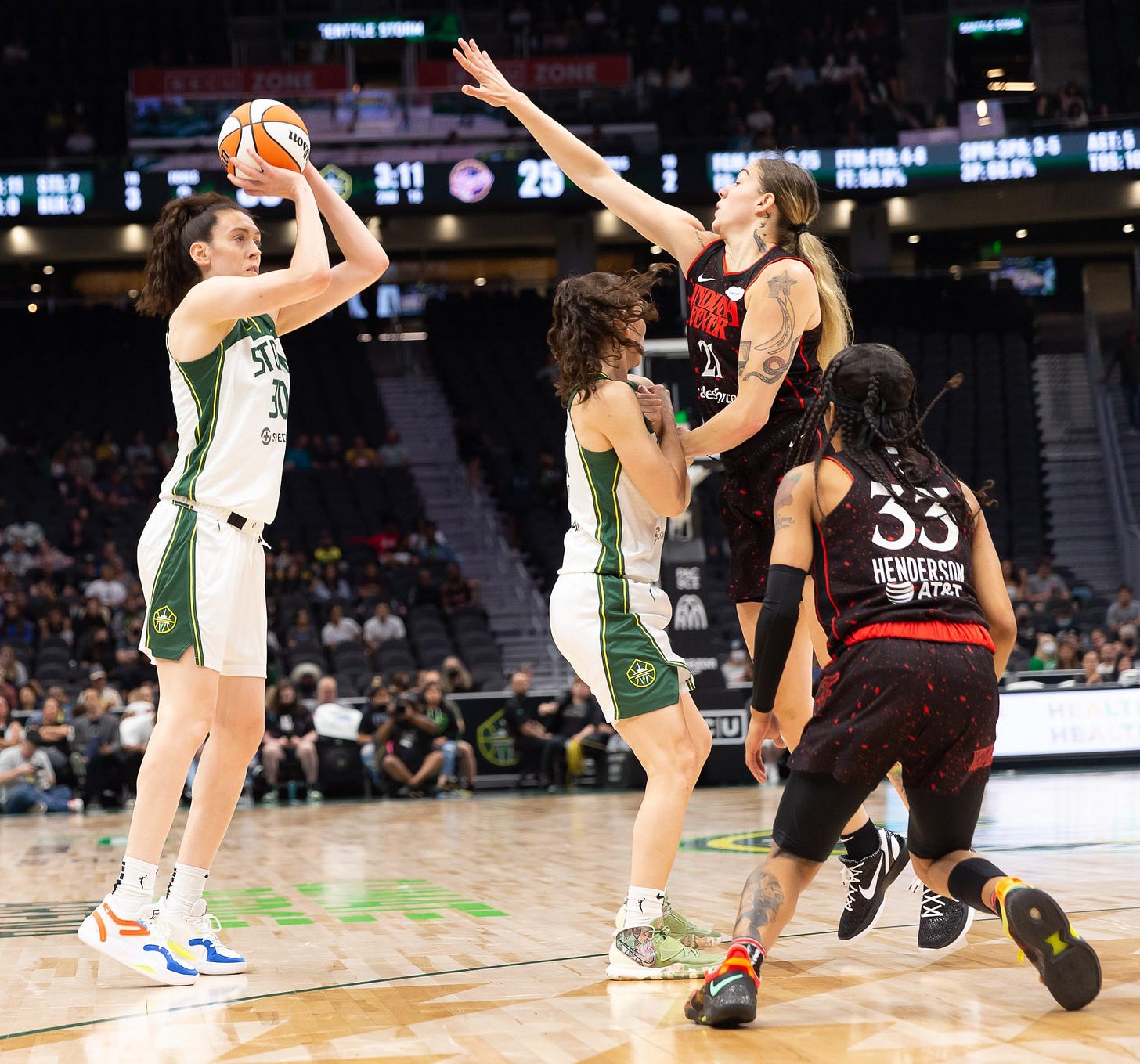 Epiphanny Prince threw the ball away which allowed Emily Engstler to knock down a three at the buzzer of the third period. Even still, Seattle led 63-42 at the end of the quarter.