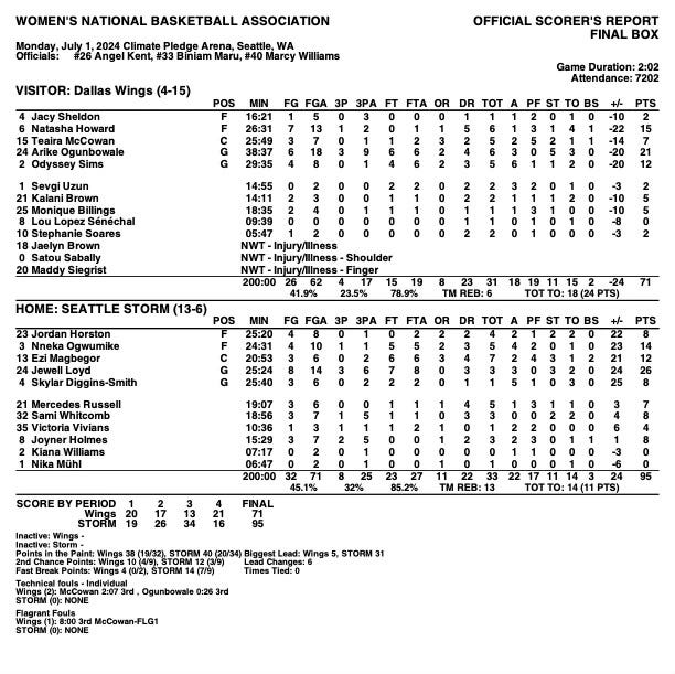The Storm outshot the Wings 45% (32-71 FG) to 42% (26-62 FG). They out-rebounded them 33-31. That included three more offensive rebounds than Dallas. Seattle had the edge in assists at 22-18 and fast break points at 14-4. Notably, the home team forced Dallas into 18 turnovers and scored 24 points off of those mistakes. They had a 13-point advantage in points off of turnovers.