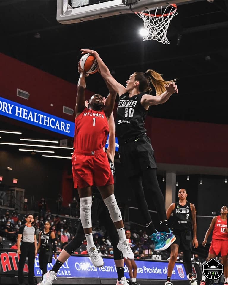 Late in the quarter with Seattle leading 42-37, Tiffany Hayes split through two defenders and finished at the rim. Odyssey Sims then stole the ball away while Seattle was trying to run out in transition. Atlanta then found Hayes in the corner who buried a three to tie the game up at 42-42 with roughly two minutes to play in the first half.