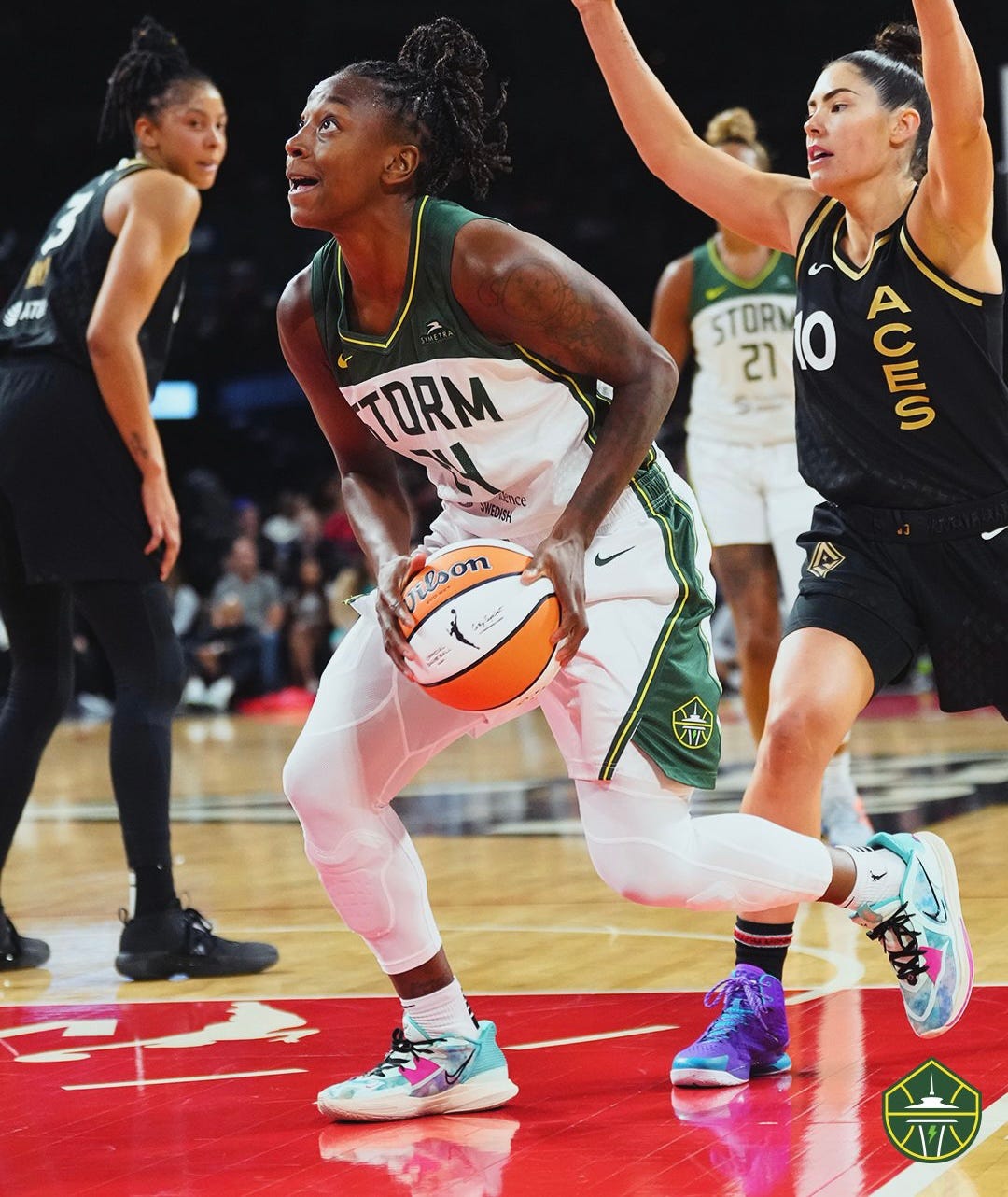 On Thursday, the team was very competitive through most of the first half. They were tied with Las Vegas, 17-17, at the end of the first period. With 2:39 left in the second quarter, Ezi Magbegor made a layup to put the Storm ahead 35-33. During those final two and a half minutes, the Aces would close the half out on a 14-2 run to lead 47-37 heading into the locker rooms.