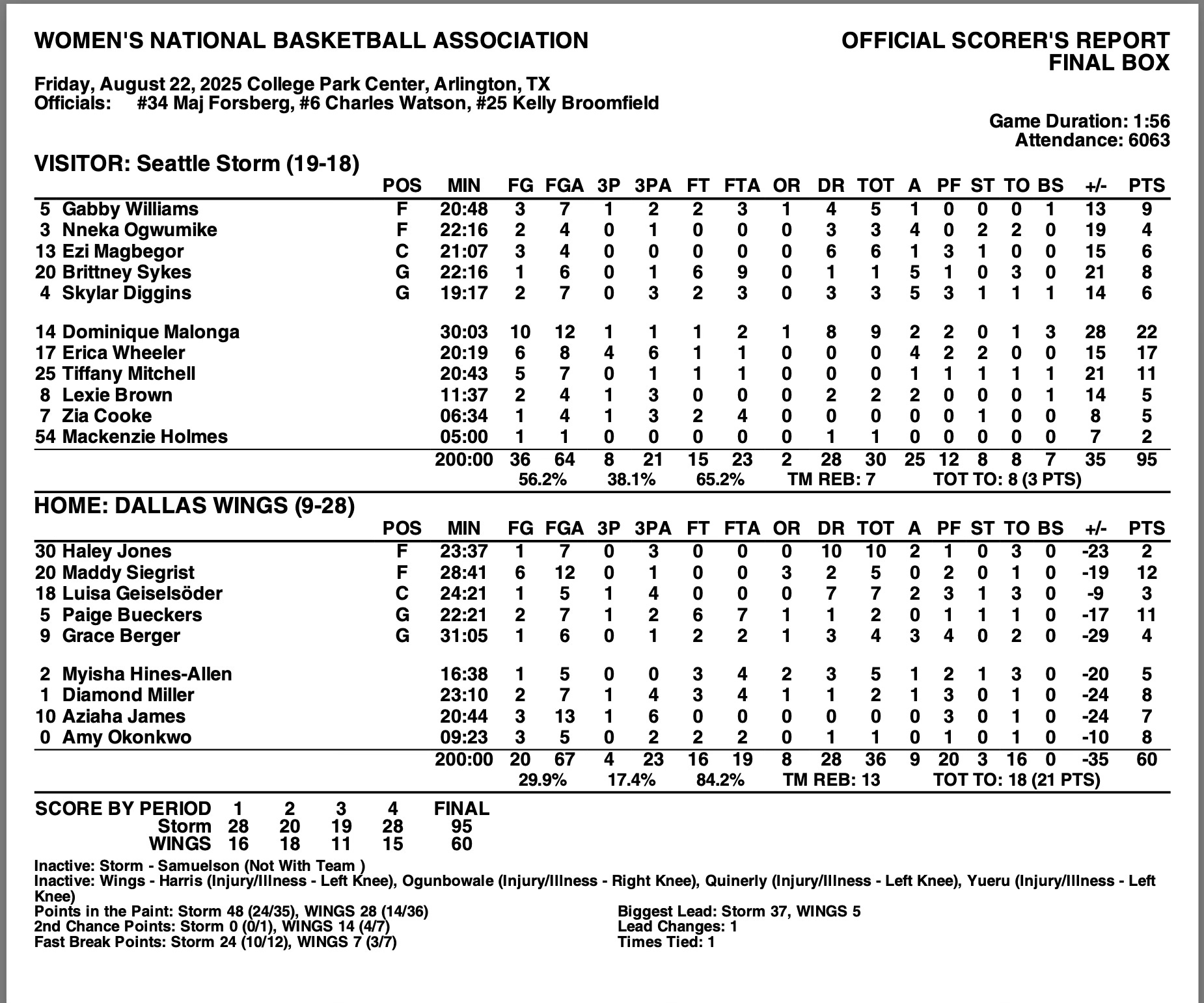 (Arlington, Texas) - The Seattle Storm (19-18) got a modicum of revenge against the Dallas Wings (9-28) after Dallas handed Seattle arguably their most embarrassing loss of the season back on July 22nd, by a final score of 87-63. The Storm returned the favor with a 35-point beatdown on the Wings’ homecourt (95-60). It was Seattle’s third win in their last four games, after they ended their six-game losing streak.