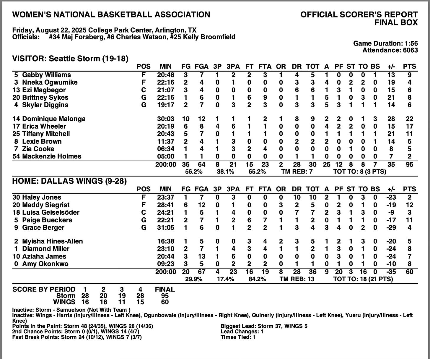 The Storm outshot the Wings 56% (36-64 FG) to 30% (20-67 FG). They also doubled Dallas’ three-point field goal makes (8-21 FG to 4-23 FG). They outscored Dallas 48-28 inside the paint. They also had a 24-7 advantage in fast break points. Seattle also forced Dallas into 18 turnovers, while only committing eight, and they outscored them 21-3 in points off turnovers.