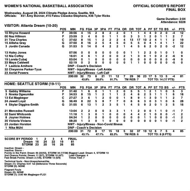Ezi Magbegor made a three-pointer. Gray countered with an AND1 finishing through contact against multiple defenders. Gabby Williams had a nice drive to the rim but Allisha Gray scored in transition just a few seconds later. Rhyne Howard made two free throws and Gabby Williams split a pair to end the half. At the midway point, the Storm led by three at 43-40. Ogwumike led the Storm with 13 points and Gray led the Dream with 13 points.
