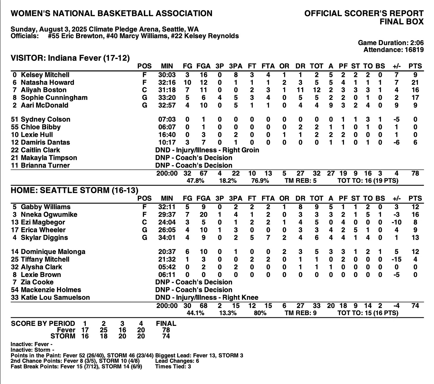 Seattle out-rebounded Indiana 33 to 32. They had a slight advantage in second-chance points (10-8). They also forced the Fever into 16 turnovers and had a slight 19-16 advantage in points off turnovers. The Storm’s reserves outscored the Fever’s bench 16-6.