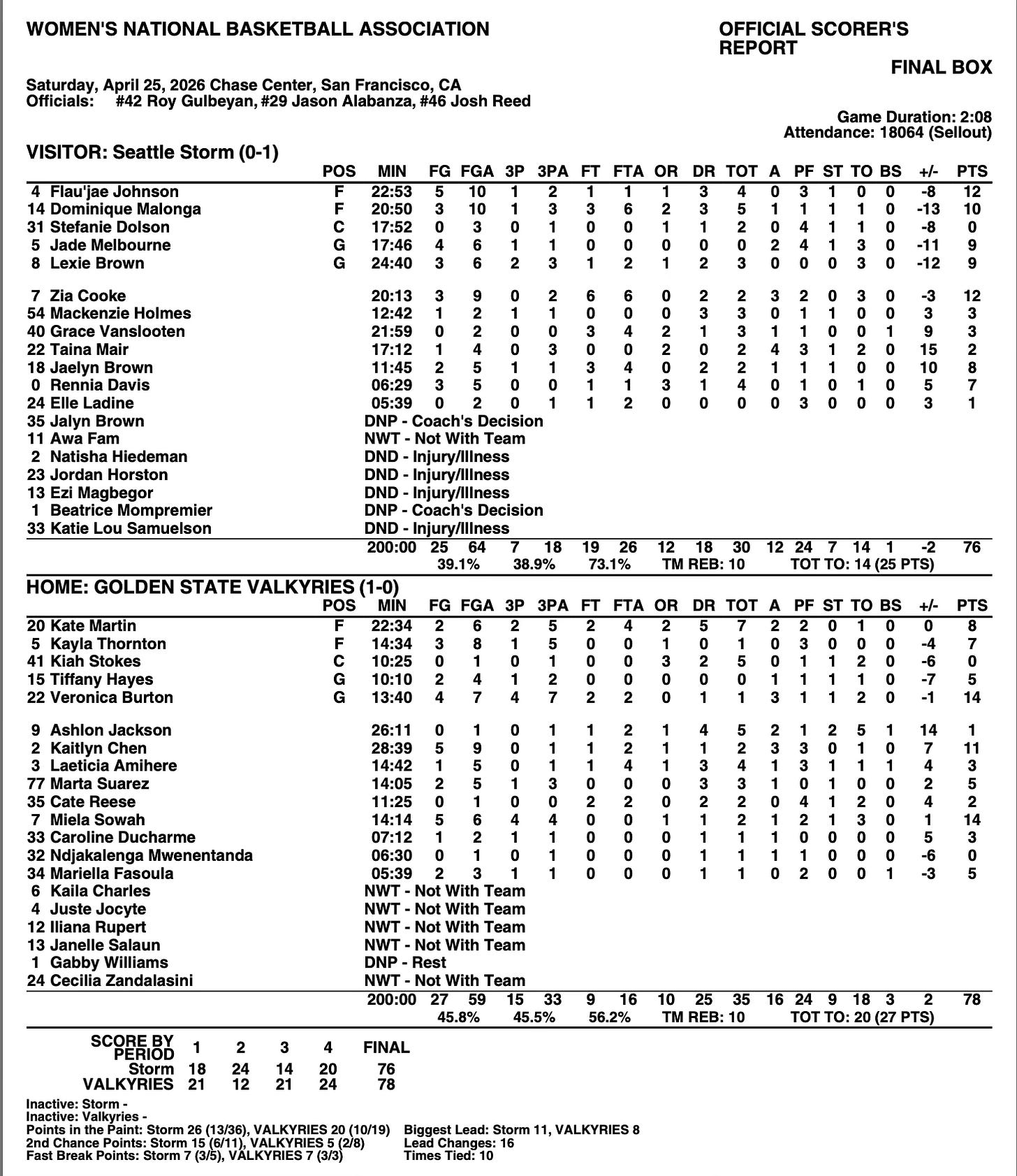 (San Francisco, California) - The WNBA opened up its preseason on Saturday, April 25th, and we got to see the new-look Seattle Storm in action against another WNBA team for the first time in 2026. The Storm were without several key players, including Jordan Horston (Left Knee), Natisha Hiedeman (Left Foot), Ezi Magbegor (Right Foot), Katie Lou Samuelson (Right Knee), and Awa Fam (NWT). At a minimum, that’s 3/5th of the team’s expected starting lineup. Despite that, they played quite well for a very young team that only started playing together six days ago. The Storm were most impressive in the first half, where they led by 11 points late in the 2nd quarter. Ultimately, a rough second half cost them the game as they were outscored 45-34 over the final two periods. They fought back late in the fourth quarter, but came up short. The Golden State Valkyries defeated the Seattle Storm 78-76.