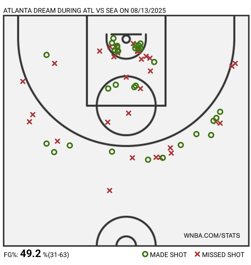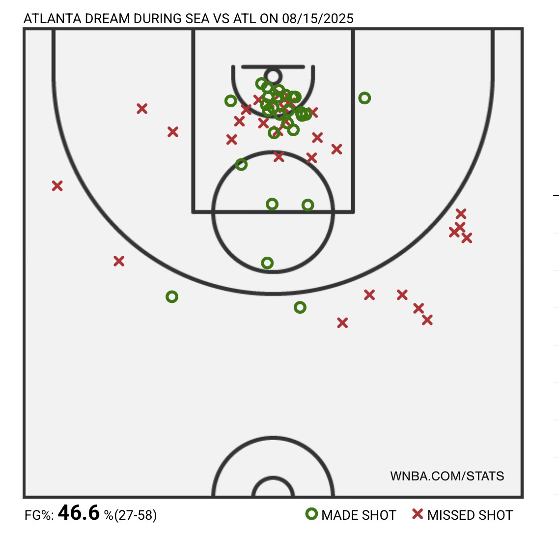 I would have to rewatch both games to do a real deep dive into all the defensive changes the Storm made in between these two games against Atlanta, but there are a few things I wanted to point out. The Storm did a significantly better job defending the perimeter. The Dream were 12-26 FG (46%) from beyond the arc on Wednesday, but just 2-13 FG (15%) on Friday night. You can view the shot charts for Atlanta from both games below.