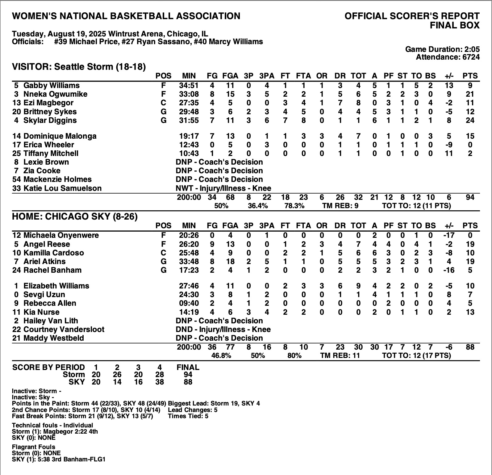 Ogwumike was fouled on her shot and made both free throws. Angel Reese scored down low. Ogwumike snagged an offensive rebound and made a beautiful turnaround jumper. Seattle nearly forced a 24-second shot clock violation, but Rachel Banham knocked down a three-pointer right before the clock expired. That put Chicago up one. The Storm countered with a 7-0 run as Malonga made back-to-back baskets. Then Tiffany Mitchell got a steal, and Williams got to the rim for the AND1. Cardoso scored on a cut to the rim. Seattle got two big blocks on one possession; first by Dom and then by Gabby. Malonga raced down the court and was fouled. She split the two free throws. Gabby scored on a pull-up, then Skylar got a steal and layup to put Seattle ahead by seven at 36-29.