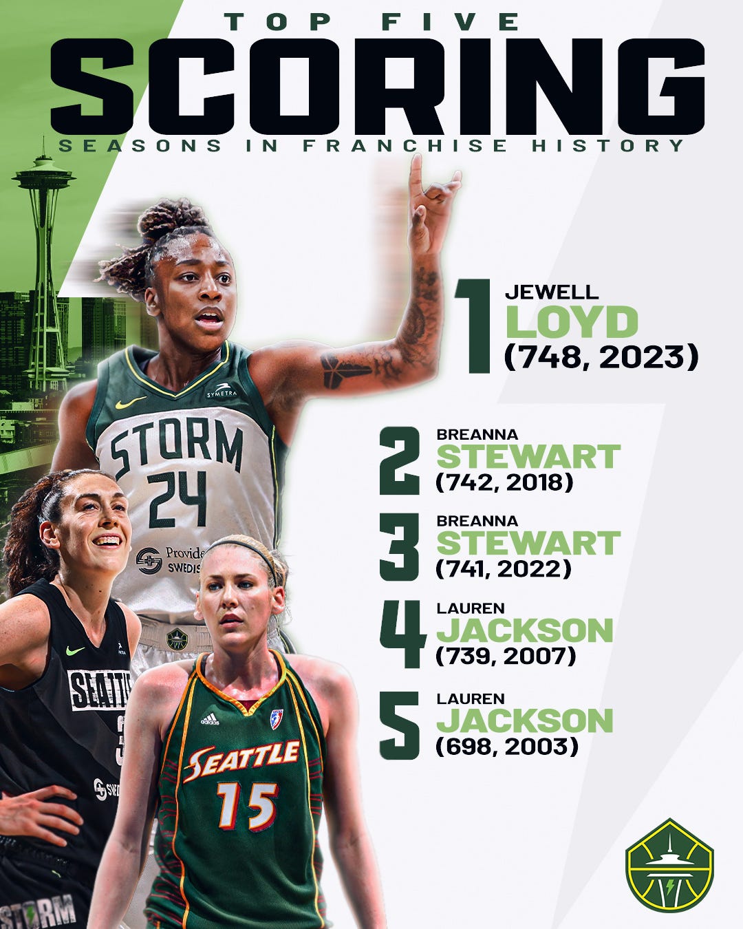 After her 26-point performance, Loyd now has 748 points on the season. She set the franchise record in 31 games played so there will be no asterisk symbol in the record books. From a pure scoring standpoint, no one has ever done it better than Jewell. She has surpassed Lauren Jackson and Breanna Stewart as the number-one scorer in any Storm season.