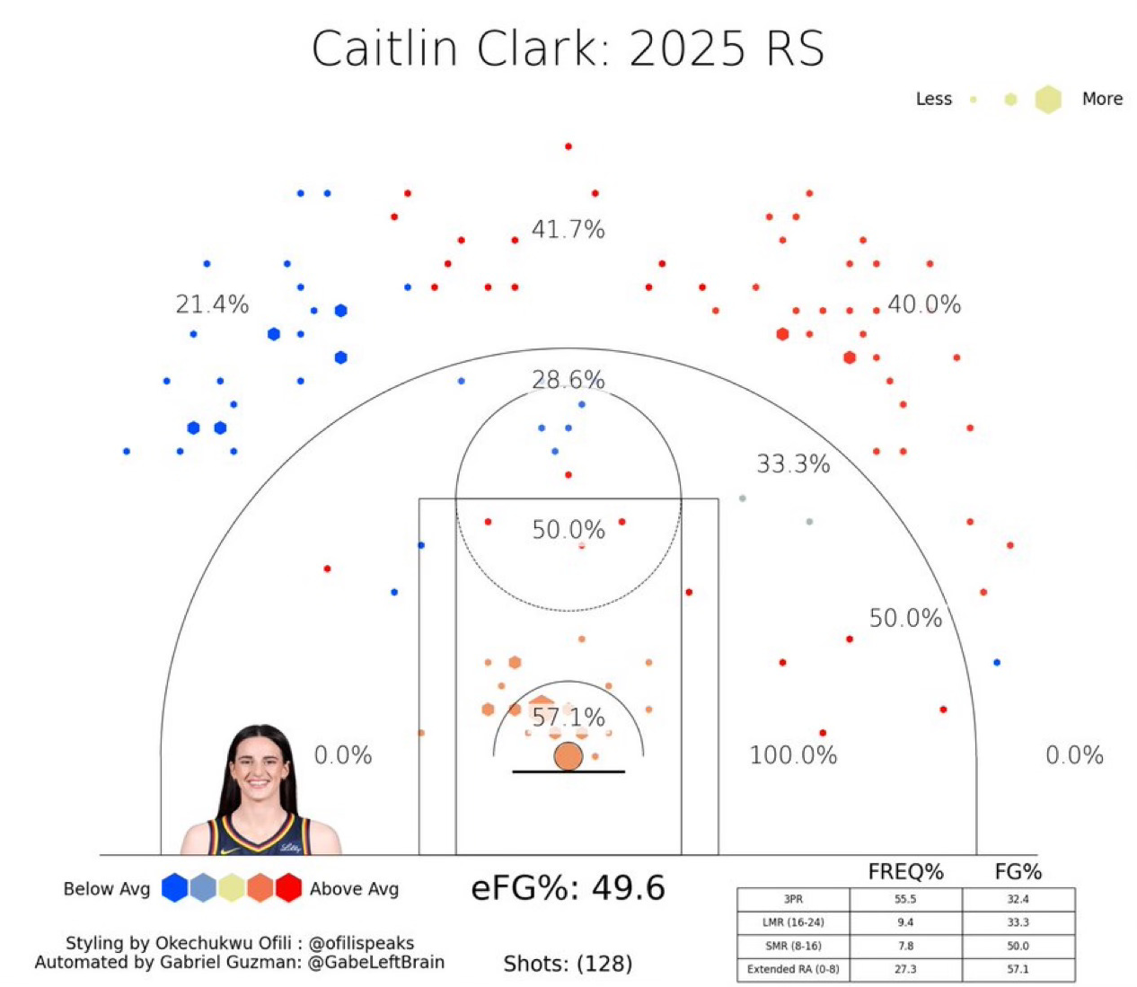 I found a shot heat map for Clark this season, and she certainly wants to go left on her three-point attempts.