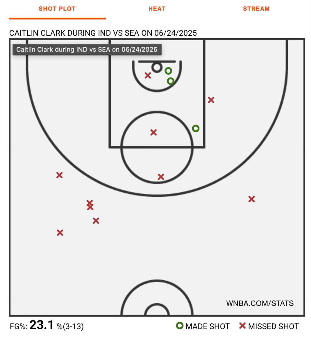 Clark scored a season-low six points against Seattle. She made just 3-13 FG and went 0-6 FG from the three-point line. Get this, Clark has played four road games and five home games this season. She has missed five games due to her quad strain injury. In her home games, Clark has made 22 out of 50 three-point field goal attempts (44%). But in her four games away from Indiana, Caitlin has made just one out of 28 three-point attempts. That’s 3.5%. Not 35%. 3.5%. WHAT?