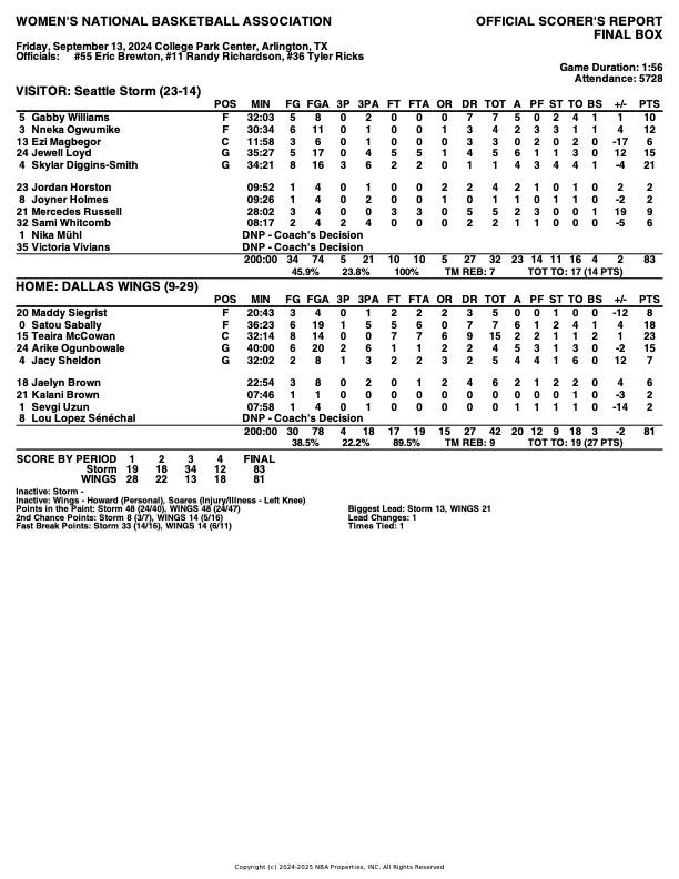 Seattle outshot Dallas 46% (34-74 FG) to 39% (30-78 FG). They were even slightly better from beyond the arc connecting on 24% (5-21 FG) compared to 22% (4-18 FG) for the Wings. The Storm had slight advantages in assists (23-20), blocks (4-3), and steals (11-9).