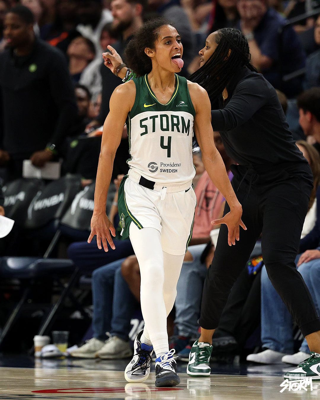 Out of the timeout, the Storm went on a 6-0 run to cut the Lynx’s lead down to two. Erica Wheeler tied the game with a three-pointer. Minnesota was completely rattled by the end of the third period. They were constantly complaining to the refs anytime something didn’t go exactly their way. Their frustration was evident. The Storm outscored the Lynx 34-17 in the third period, capped off by a Diggins’ three-pointer in Napheesa Collier’s face. Diggins then was yapping at anyone within earshot.