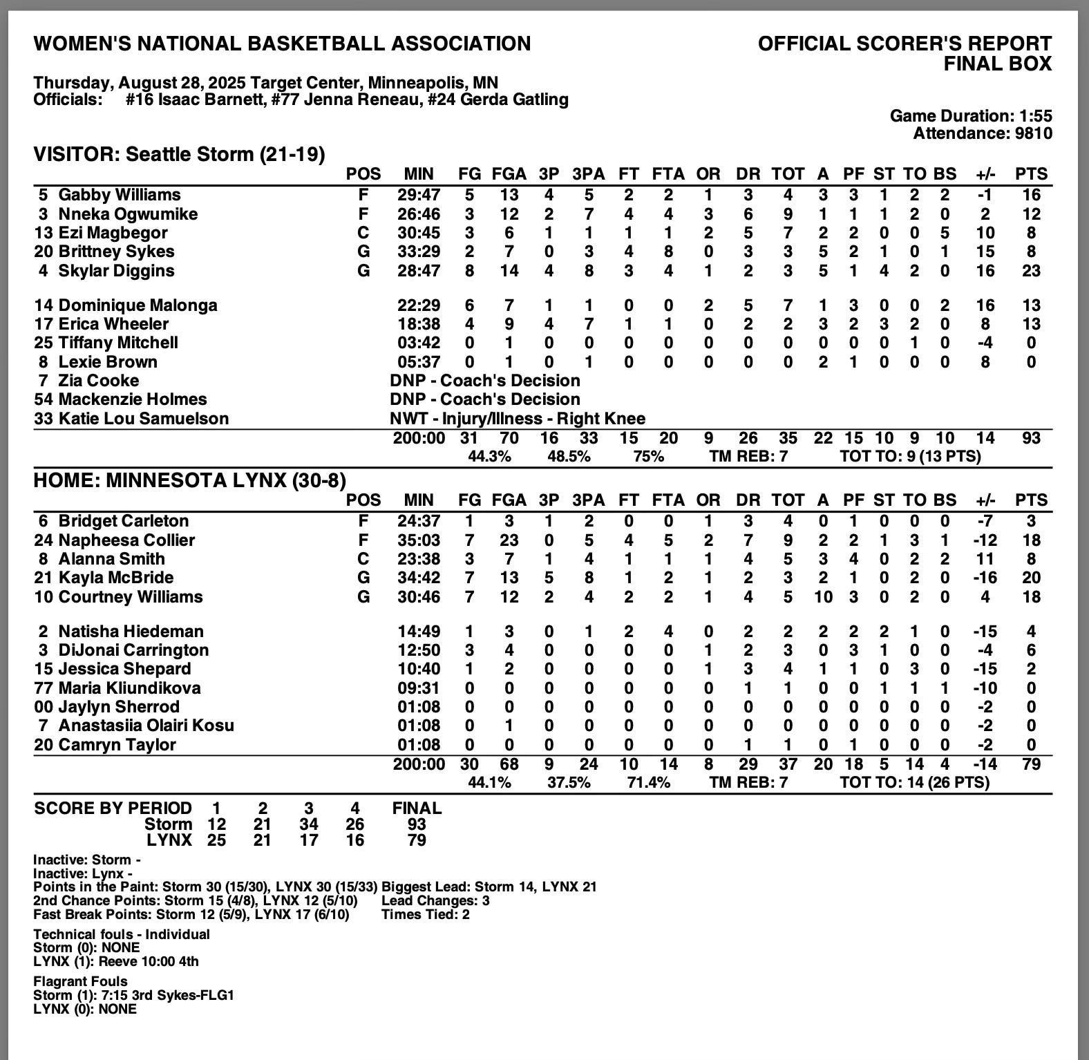 The road team forced the Lynx into 14 turnovers and outscored Minnesota 26-13 in points off turnovers. Despite losing the rebounding battle by a couple, the Storm had a 15-12 advantage in second-chance points. Both teams were even (30-30) with points in the paint.